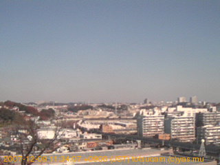 適度に曇った日の雲の動き (例: 2005-10-24) がとても楽しめます。 正面を横切っている高架は横須賀線下りです。 その下に横須賀線上り、東海道線、同貨物線が走っていますが、 高架に隠れていてよく見えません。 夜間は特に中央左寄りの車の動きがよく見えます。