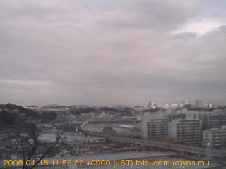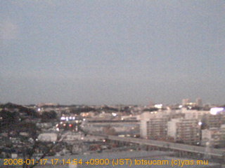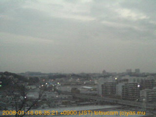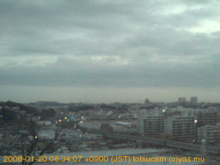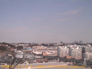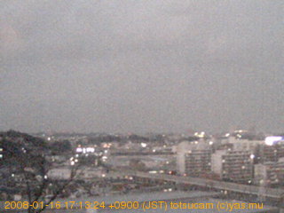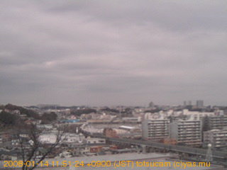 適度に曇った日の雲の動き (例: 2005-10-24) がとても楽しめます。 正面を横切っている高架は横須賀線下りです。 その下に横須賀線上り、東海道線、同貨物線が走っていますが、 高架に隠れていてよく見えません。 夜間は特に中央左寄りの車の動きがよく見えます。