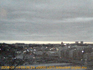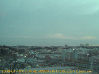 横浜市戸塚駅周辺から 東戸塚方面(北北東)を望む展望カメラの映像です。 左は現在の映像です。 下に並んでいるのは、 7日間に亘る日の出どき、昼間、夕暮れどきの写真(サムネイル)です。 それぞれ、日の出15分前、南中時、日没20分後の写真となっています。 各写真の下にはmpeg形式の動画へのリンクがあります。 それぞれ、日の出、南中、日没の前後1時間の画像です。 右欄にはその日24時間の動画へのリンクがあります。 この7日間以外は日付が一覧表示されています。 日付部分をクリックすると、 その日付から7日分が展開されて表示されます。