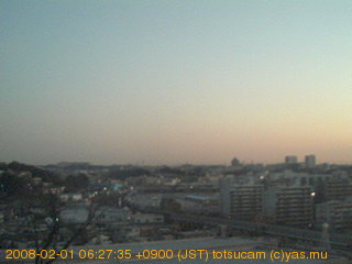 横浜市戸塚駅周辺から 東戸塚方面(北北東)を望む展望カメラの映像です。 左は現在の映像です。 下に並んでいるのは、 7日間に亘る日の出どき、昼間、夕暮れどきの写真(サムネイル)です。 それぞれ、日の出15分前、南中時、日没20分後の写真となっています。 各写真の下にはmpeg形式の動画へのリンクがあります。 それぞれ、日の出、南中、日没の前後1時間の画像です。 右欄にはその日24時間の動画へのリンクがあります。 この7日間以外は日付が一覧表示されています。 日付部分をクリックすると、 その日付から7日分が展開されて表示されます。