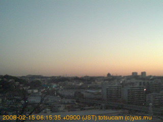 横浜市戸塚駅周辺から 東戸塚方面(北北東)を望む展望カメラの映像です。 左は現在の映像です。 下に並んでいるのは、 7日間に亘る日の出どき、昼間、夕暮れどきの写真(サムネイル)です。 それぞれ、日の出15分前、南中時、日没20分後の写真となっています。 各写真の下にはmpeg形式の動画へのリンクがあります。 それぞれ、日の出、南中、日没の前後1時間の画像です。 右欄にはその日24時間の動画へのリンクがあります。 この7日間以外は日付が一覧表示されています。 日付部分をクリックすると、 その日付から7日分が展開されて表示されます。