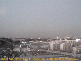 適度に曇った日の雲の動き (例: 2005-10-24) がとても楽しめます。 正面を横切っている高架は横須賀線下りです。 その下に横須賀線上り、東海道線、同貨物線が走っていますが、 高架に隠れていてよく見えません。 夜間は特に中央左寄りの車の動きがよく見えます。