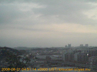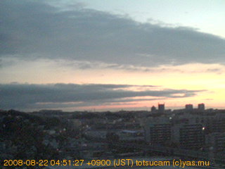 横浜市戸塚駅周辺から 東戸塚方面(北北東)を望む展望カメラの映像です。 左は現在の映像です。 下に並んでいるのは、 7日間に亘る日の出どき、昼間、夕暮れどきの写真(サムネイル)です。 それぞれ、日の出15分前、南中時、日没20分後の写真となっています。 各写真の下にはmpeg形式の動画へのリンクがあります。 それぞれ、日の出、南中、日没の前後1時間の画像です。 右欄にはその日24時間の動画へのリンクがあります。 この7日間以外は日付が一覧表示されています。 日付部分をクリックすると、 その日付から7日分が展開されて表示されます。