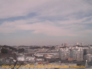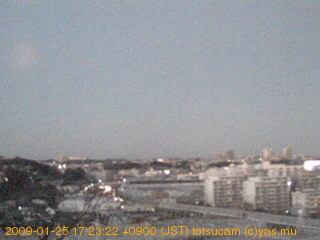 適度に曇った日の雲の動き (例: 2005-10-24) がとても楽しめます。 正面を横切っている高架は横須賀線下りです。 その下に横須賀線上り、東海道線、同貨物線が走っていますが、 高架に隠れていてよく見えません。 夜間は特に中央左寄りの車の動きがよく見えます。