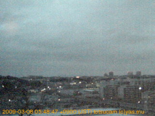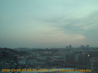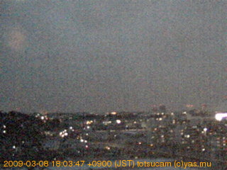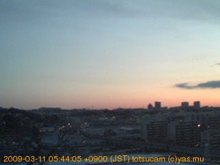 横浜市戸塚駅周辺から 東戸塚方面(北北東)を望む展望カメラの映像です。 左は現在の映像です。 下に並んでいるのは、 7日間に亘る日の出どき、昼間、夕暮れどきの写真(サムネイル)です。 それぞれ、日の出15分前、南中時、日没20分後の写真となっています。 各写真の下にはmpeg形式の動画へのリンクがあります。 それぞれ、日の出、南中、日没の前後1時間の画像です。 右欄にはその日24時間の動画へのリンクがあります。 この7日間以外は日付が一覧表示されています。 日付部分をクリックすると、 その日付から7日分が展開されて表示されます。