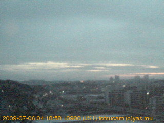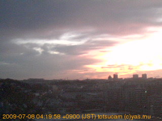 横浜市戸塚駅周辺から 東戸塚方面(北北東)を望む展望カメラの映像です。 左は現在の映像です。 下に並んでいるのは、 7日間に亘る日の出どき、昼間、夕暮れどきの写真(サムネイル)です。 それぞれ、日の出15分前、南中時、日没20分後の写真となっています。 各写真の下にはmpeg形式の動画へのリンクがあります。 それぞれ、日の出、南中、日没の前後1時間の画像です。 右欄にはその日24時間の動画へのリンクがあります。 この7日間以外は日付が一覧表示されています。 日付部分をクリックすると、 その日付から7日分が展開されて表示されます。