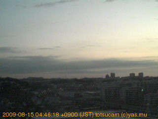 横浜市戸塚駅周辺から 東戸塚方面(北北東)を望む展望カメラの映像です。 左は現在の映像です。 下に並んでいるのは、 7日間に亘る日の出どき、昼間、夕暮れどきの写真(サムネイル)です。 それぞれ、日の出15分前、南中時、日没20分後の写真となっています。 各写真の下にはmpeg形式の動画へのリンクがあります。 それぞれ、日の出、南中、日没の前後1時間の画像です。 右欄にはその日24時間の動画へのリンクがあります。 この7日間以外は日付が一覧表示されています。 日付部分をクリックすると、 その日付から7日分が展開されて表示されます。