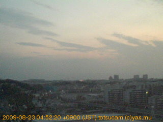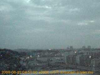 横浜市戸塚駅周辺から 東戸塚方面(北北東)を望む展望カメラの映像です。 左は現在の映像です。 下に並んでいるのは、 7日間に亘る日の出どき、昼間、夕暮れどきの写真(サムネイル)です。 それぞれ、日の出15分前、南中時、日没20分後の写真となっています。 各写真の下にはmpeg形式の動画へのリンクがあります。 それぞれ、日の出、南中、日没の前後1時間の画像です。 右欄にはその日24時間の動画へのリンクがあります。 この7日間以外は日付が一覧表示されています。 日付部分をクリックすると、 その日付から7日分が展開されて表示されます。