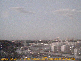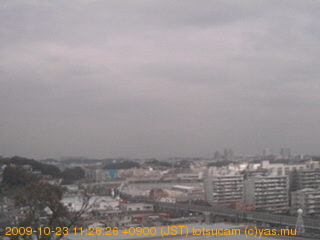 適度に曇った日の雲の動き (例: 2005-10-24) がとても楽しめます。 正面を横切っている高架は横須賀線下りです。 その下に横須賀線上り、東海道線、同貨物線が走っていますが、 高架に隠れていてよく見えません。 夜間は特に中央左寄りの車の動きがよく見えます。