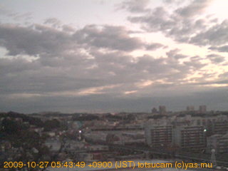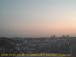 横浜市戸塚駅周辺から 東戸塚方面(北北東)を望む展望カメラの映像です。 左は現在の映像です。 下に並んでいるのは、 7日間に亘る日の出どき、昼間、夕暮れどきの写真(サムネイル)です。 それぞれ、日の出15分前、南中時、日没20分後の写真となっています。 各写真の下にはmpeg形式の動画へのリンクがあります。 それぞれ、日の出、南中、日没の前後1時間の画像です。 右欄にはその日24時間の動画へのリンクがあります。 この7日間以外は日付が一覧表示されています。 日付部分をクリックすると、 その日付から7日分が展開されて表示されます。