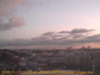 横浜市戸塚駅周辺から 東戸塚方面(北北東)を望む展望カメラの映像です。 左は現在の映像です。 下に並んでいるのは、 7日間に亘る日の出どき、昼間、夕暮れどきの写真(サムネイル)です。 それぞれ、日の出15分前、南中時、日没20分後の写真となっています。 各写真の下にはmpeg形式の動画へのリンクがあります。 それぞれ、日の出、南中、日没の前後1時間の画像です。 右欄にはその日24時間の動画へのリンクがあります。 この7日間以外は日付が一覧表示されています。 日付部分をクリックすると、 その日付から7日分が展開されて表示されます。