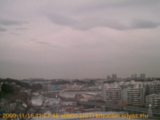 適度に曇った日の雲の動き (例: 2005-10-24) がとても楽しめます。 正面を横切っている高架は横須賀線下りです。 その下に横須賀線上り、東海道線、同貨物線が走っていますが、 高架に隠れていてよく見えません。 夜間は特に中央左寄りの車の動きがよく見えます。
