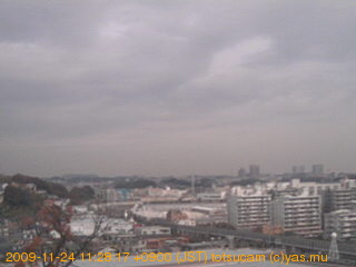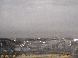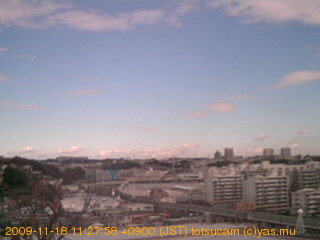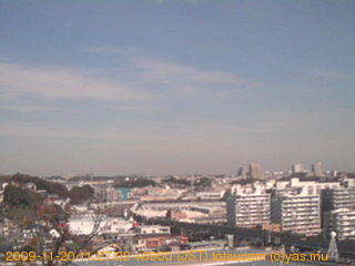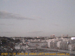 適度に曇った日の雲の動き (例: 2005-10-24) がとても楽しめます。 正面を横切っている高架は横須賀線下りです。 その下に横須賀線上り、東海道線、同貨物線が走っていますが、 高架に隠れていてよく見えません。 夜間は特に中央左寄りの車の動きがよく見えます。