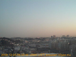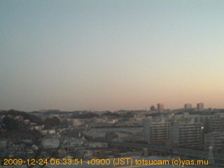 横浜市戸塚駅周辺から 東戸塚方面(北北東)を望む展望カメラの映像です。 左は現在の映像です。 下に並んでいるのは、 7日間に亘る日の出どき、昼間、夕暮れどきの写真(サムネイル)です。 それぞれ、日の出15分前、南中時、日没20分後の写真となっています。 各写真の下にはmpeg形式の動画へのリンクがあります。 それぞれ、日の出、南中、日没の前後1時間の画像です。 右欄にはその日24時間の動画へのリンクがあります。 この7日間以外は日付が一覧表示されています。 日付部分をクリックすると、 その日付から7日分が展開されて表示されます。