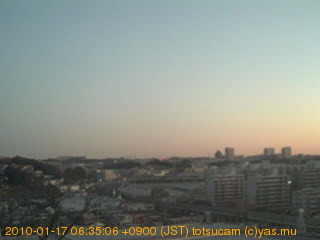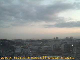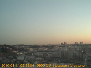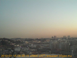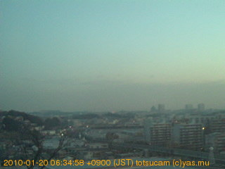 横浜市戸塚駅周辺から 東戸塚方面(北北東)を望む展望カメラの映像です。 左は現在の映像です。 下に並んでいるのは、 7日間に亘る日の出どき、昼間、夕暮れどきの写真(サムネイル)です。 それぞれ、日の出15分前、南中時、日没20分後の写真となっています。 各写真の下にはmpeg形式の動画へのリンクがあります。 それぞれ、日の出、南中、日没の前後1時間の画像です。 右欄にはその日24時間の動画へのリンクがあります。 この7日間以外は日付が一覧表示されています。 日付部分をクリックすると、 その日付から7日分が展開されて表示されます。