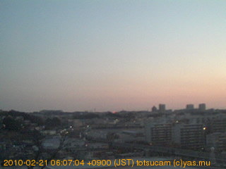 横浜市戸塚駅周辺から 東戸塚方面(北北東)を望む展望カメラの映像です。 左は現在の映像です。 下に並んでいるのは、 7日間に亘る日の出どき、昼間、夕暮れどきの写真(サムネイル)です。 それぞれ、日の出15分前、南中時、日没20分後の写真となっています。 各写真の下にはmpeg形式の動画へのリンクがあります。 それぞれ、日の出、南中、日没の前後1時間の画像です。 右欄にはその日24時間の動画へのリンクがあります。 この7日間以外は日付が一覧表示されています。 日付部分をクリックすると、 その日付から7日分が展開されて表示されます。