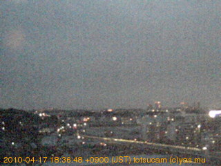 適度に曇った日の雲の動き (例: 2005-10-24) がとても楽しめます。 正面を横切っている高架は横須賀線下りです。 その下に横須賀線上り、東海道線、同貨物線が走っていますが、 高架に隠れていてよく見えません。 夜間は特に中央左寄りの車の動きがよく見えます。