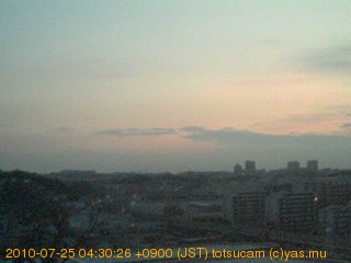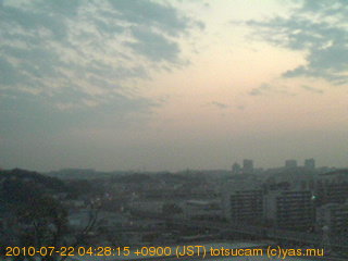 横浜市戸塚駅周辺から 東戸塚方面(北北東)を望む展望カメラの映像です。 左は現在の映像です。 下に並んでいるのは、 7日間に亘る日の出どき、昼間、夕暮れどきの写真(サムネイル)です。 それぞれ、日の出15分前、南中時、日没20分後の写真となっています。 各写真の下にはmpeg形式の動画へのリンクがあります。 それぞれ、日の出、南中、日没の前後1時間の画像です。 右欄にはその日24時間の動画へのリンクがあります。 この7日間以外は日付が一覧表示されています。 日付部分をクリックすると、 その日付から7日分が展開されて表示されます。