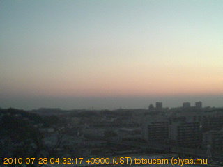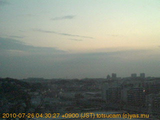 横浜市戸塚駅周辺から 東戸塚方面(北北東)を望む展望カメラの映像です。 左は現在の映像です。 下に並んでいるのは、 7日間に亘る日の出どき、昼間、夕暮れどきの写真(サムネイル)です。 それぞれ、日の出15分前、南中時、日没20分後の写真となっています。 各写真の下にはmpeg形式の動画へのリンクがあります。 それぞれ、日の出、南中、日没の前後1時間の画像です。 右欄にはその日24時間の動画へのリンクがあります。 この7日間以外は日付が一覧表示されています。 日付部分をクリックすると、 その日付から7日分が展開されて表示されます。
