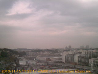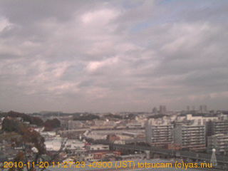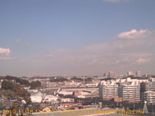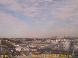 適度に曇った日の雲の動き (例: 2005-10-24) がとても楽しめます。 正面を横切っている高架は横須賀線下りです。 その下に横須賀線上り、東海道線、同貨物線が走っていますが、 高架に隠れていてよく見えません。 夜間は特に中央左寄りの車の動きがよく見えます。