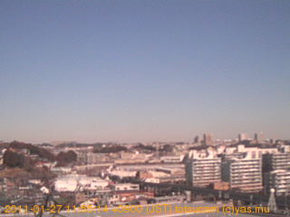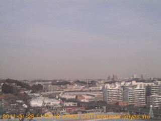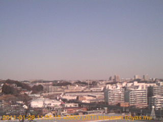 適度に曇った日の雲の動き (例: 2005-10-24) がとても楽しめます。 正面を横切っている高架は横須賀線下りです。 その下に横須賀線上り、東海道線、同貨物線が走っていますが、 高架に隠れていてよく見えません。 夜間は特に中央左寄りの車の動きがよく見えます。