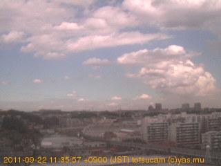 横浜市戸塚駅周辺から 東戸塚方面(北北東)を望む展望カメラの映像です。 左は現在の映像です。 下に並んでいるのは、 7日間に亘る日の出どき、昼間、夕暮れどきの写真(サムネイル)です。 それぞれ、日の出15分前、南中時、日没20分後の写真となっています。 各写真の下にはmpeg形式の動画へのリンクがあります。 それぞれ、日の出、南中、日没の前後1時間の画像です。 右欄にはその日24時間の動画へのリンクがあります。 この7日間以外は日付が一覧表示されています。 日付部分をクリックすると、 その日付から7日分が展開されて表示されます。