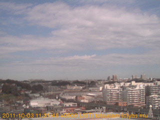 適度に曇った日の雲の動き (例: 2005-10-24) がとても楽しめます。 正面を横切っている高架は横須賀線下りです。 その下に横須賀線上り、東海道線、同貨物線が走っていますが、 高架に隠れていてよく見えません。 夜間は特に中央左寄りの車の動きがよく見えます。