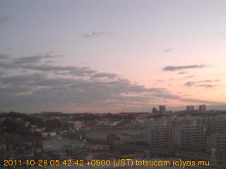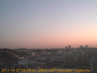 横浜市戸塚駅周辺から 東戸塚方面(北北東)を望む展望カメラの映像です。 左は現在の映像です。 下に並んでいるのは、 7日間に亘る日の出どき、昼間、夕暮れどきの写真(サムネイル)です。 それぞれ、日の出15分前、南中時、日没20分後の写真となっています。 各写真の下にはmpeg形式の動画へのリンクがあります。 それぞれ、日の出、南中、日没の前後1時間の画像です。 右欄にはその日24時間の動画へのリンクがあります。 この7日間以外は日付が一覧表示されています。 日付部分をクリックすると、 その日付から7日分が展開されて表示されます。