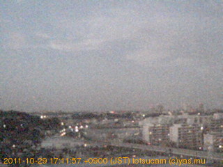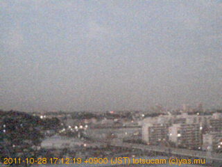適度に曇った日の雲の動き (例: 2005-10-24) がとても楽しめます。 正面を横切っている高架は横須賀線下りです。 その下に横須賀線上り、東海道線、同貨物線が走っていますが、 高架に隠れていてよく見えません。 夜間は特に中央左寄りの車の動きがよく見えます。