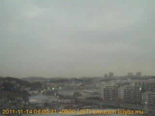 適度に曇った日の雲の動き (例: 2005-10-24) がとても楽しめます。 正面を横切っている高架は横須賀線下りです。 その下に横須賀線上り、東海道線、同貨物線が走っていますが、 高架に隠れていてよく見えません。 夜間は特に中央左寄りの車の動きがよく見えます。