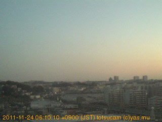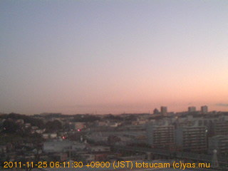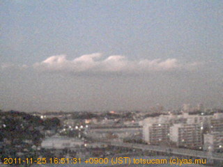 横浜市戸塚駅周辺から 東戸塚方面(北北東)を望む展望カメラの映像です。 左は現在の映像です。 下に並んでいるのは、 7日間に亘る日の出どき、昼間、夕暮れどきの写真(サムネイル)です。 それぞれ、日の出15分前、南中時、日没20分後の写真となっています。 各写真の下にはmpeg形式の動画へのリンクがあります。 それぞれ、日の出、南中、日没の前後1時間の画像です。 右欄にはその日24時間の動画へのリンクがあります。 この7日間以外は日付が一覧表示されています。 日付部分をクリックすると、 その日付から7日分が展開されて表示されます。