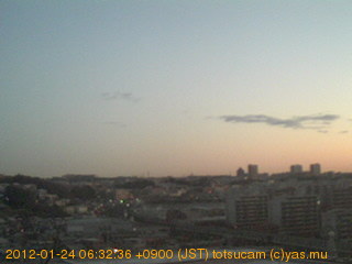 横浜市戸塚駅周辺から 東戸塚方面(北北東)を望む展望カメラの映像です。 左は現在の映像です。 下に並んでいるのは、 7日間に亘る日の出どき、昼間、夕暮れどきの写真(サムネイル)です。 それぞれ、日の出15分前、南中時、日没20分後の写真となっています。 各写真の下にはmpeg形式の動画へのリンクがあります。 それぞれ、日の出、南中、日没の前後1時間の画像です。 右欄にはその日24時間の動画へのリンクがあります。 この7日間以外は日付が一覧表示されています。 日付部分をクリックすると、 その日付から7日分が展開されて表示されます。