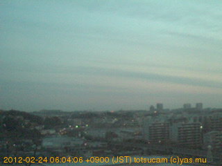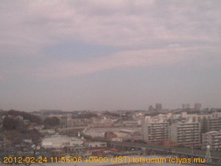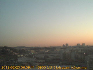 横浜市戸塚駅周辺から 東戸塚方面(北北東)を望む展望カメラの映像です。 左は現在の映像です。 下に並んでいるのは、 7日間に亘る日の出どき、昼間、夕暮れどきの写真(サムネイル)です。 それぞれ、日の出15分前、南中時、日没20分後の写真となっています。 各写真の下にはmpeg形式の動画へのリンクがあります。 それぞれ、日の出、南中、日没の前後1時間の画像です。 右欄にはその日24時間の動画へのリンクがあります。 この7日間以外は日付が一覧表示されています。 日付部分をクリックすると、 その日付から7日分が展開されて表示されます。