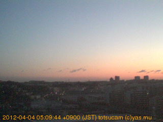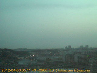 横浜市戸塚駅周辺から 東戸塚方面(北北東)を望む展望カメラの映像です。 左は現在の映像です。 下に並んでいるのは、 7日間に亘る日の出どき、昼間、夕暮れどきの写真(サムネイル)です。 それぞれ、日の出15分前、南中時、日没20分後の写真となっています。 各写真の下にはmpeg形式の動画へのリンクがあります。 それぞれ、日の出、南中、日没の前後1時間の画像です。 右欄にはその日24時間の動画へのリンクがあります。 この7日間以外は日付が一覧表示されています。 日付部分をクリックすると、 その日付から7日分が展開されて表示されます。