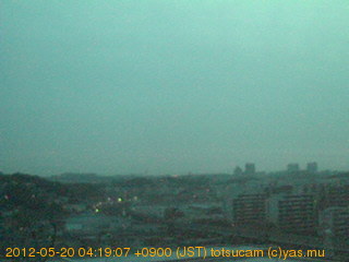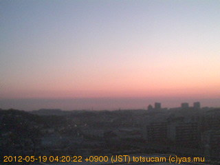 横浜市戸塚駅周辺から 東戸塚方面(北北東)を望む展望カメラの映像です。 左は現在の映像です。 下に並んでいるのは、 7日間に亘る日の出どき、昼間、夕暮れどきの写真(サムネイル)です。 それぞれ、日の出15分前、南中時、日没20分後の写真となっています。 各写真の下にはmpeg形式の動画へのリンクがあります。 それぞれ、日の出、南中、日没の前後1時間の画像です。 右欄にはその日24時間の動画へのリンクがあります。 この7日間以外は日付が一覧表示されています。 日付部分をクリックすると、 その日付から7日分が展開されて表示されます。