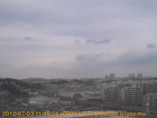 適度に曇った日の雲の動き (例: 2005-10-24) がとても楽しめます。 正面を横切っている高架は横須賀線下りです。 その下に横須賀線上り、東海道線、同貨物線が走っていますが、 高架に隠れていてよく見えません。 夜間は特に中央左寄りの車の動きがよく見えます。