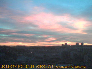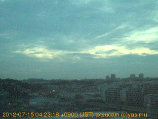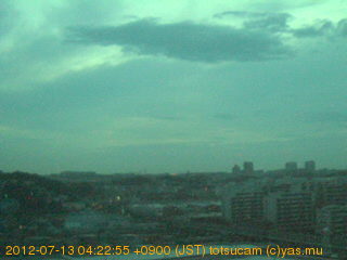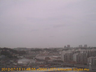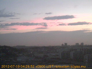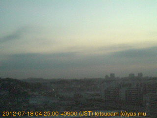横浜市戸塚駅周辺から 東戸塚方面(北北東)を望む展望カメラの映像です。 左は現在の映像です。 下に並んでいるのは、 7日間に亘る日の出どき、昼間、夕暮れどきの写真(サムネイル)です。 それぞれ、日の出15分前、南中時、日没20分後の写真となっています。 各写真の下にはmpeg形式の動画へのリンクがあります。 それぞれ、日の出、南中、日没の前後1時間の画像です。 右欄にはその日24時間の動画へのリンクがあります。 この7日間以外は日付が一覧表示されています。 日付部分をクリックすると、 その日付から7日分が展開されて表示されます。