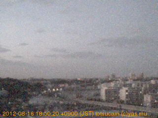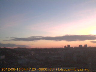 横浜市戸塚駅周辺から 東戸塚方面(北北東)を望む展望カメラの映像です。 左は現在の映像です。 下に並んでいるのは、 7日間に亘る日の出どき、昼間、夕暮れどきの写真(サムネイル)です。 それぞれ、日の出15分前、南中時、日没20分後の写真となっています。 各写真の下にはmpeg形式の動画へのリンクがあります。 それぞれ、日の出、南中、日没の前後1時間の画像です。 右欄にはその日24時間の動画へのリンクがあります。 この7日間以外は日付が一覧表示されています。 日付部分をクリックすると、 その日付から7日分が展開されて表示されます。