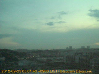 横浜市戸塚駅周辺から 東戸塚方面(北北東)を望む展望カメラの映像です。 左は現在の映像です。 下に並んでいるのは、 7日間に亘る日の出どき、昼間、夕暮れどきの写真(サムネイル)です。 それぞれ、日の出15分前、南中時、日没20分後の写真となっています。 各写真の下にはmpeg形式の動画へのリンクがあります。 それぞれ、日の出、南中、日没の前後1時間の画像です。 右欄にはその日24時間の動画へのリンクがあります。 この7日間以外は日付が一覧表示されています。 日付部分をクリックすると、 その日付から7日分が展開されて表示されます。