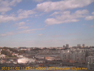 適度に曇った日の雲の動き (例: 2005-10-24) がとても楽しめます。 正面を横切っている高架は横須賀線下りです。 その下に横須賀線上り、東海道線、同貨物線が走っていますが、 高架に隠れていてよく見えません。 夜間は特に中央左寄りの車の動きがよく見えます。