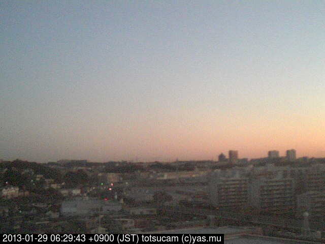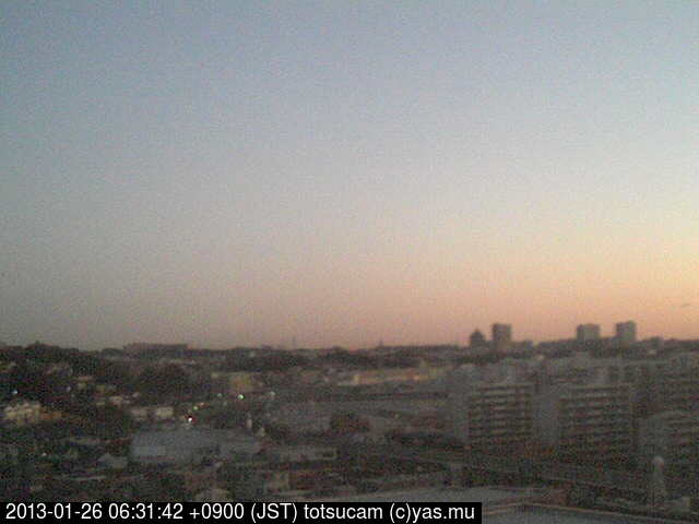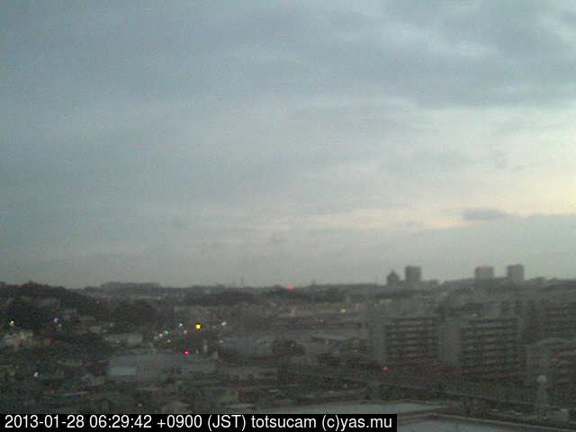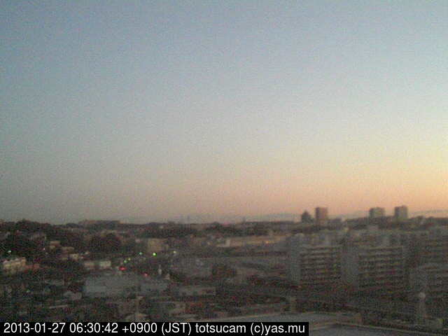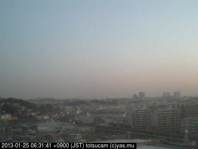 横浜市戸塚駅周辺から 東戸塚方面(北北東)を望む展望カメラの映像です。 左は現在の映像です。 下に並んでいるのは、 7日間に亘る日の出どき、昼間、夕暮れどきの写真(サムネイル)です。 それぞれ、日の出15分前、南中時、日没20分後の写真となっています。 各写真の下にはmpeg形式の動画へのリンクがあります。 それぞれ、日の出、南中、日没の前後1時間の画像です。 右欄にはその日24時間の動画へのリンクがあります。 この7日間以外は日付が一覧表示されています。 日付部分をクリックすると、 その日付から7日分が展開されて表示されます。