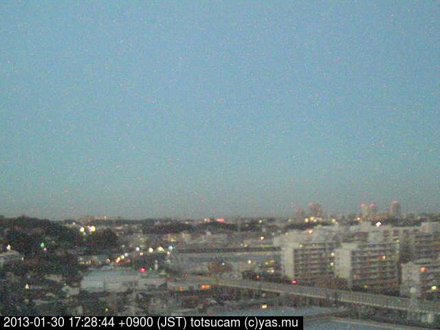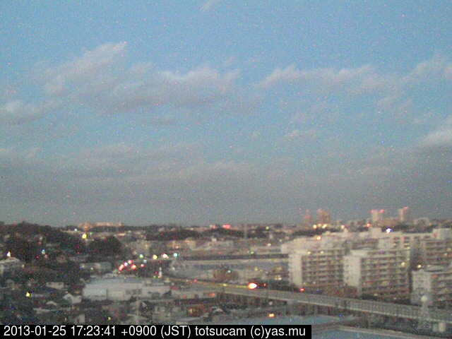 適度に曇った日の雲の動き (例: 2005-10-24) がとても楽しめます。 正面を横切っている高架は横須賀線下りです。 その下に横須賀線上り、東海道線、同貨物線が走っていますが、 高架に隠れていてよく見えません。 夜間は特に中央左寄りの車の動きがよく見えます。