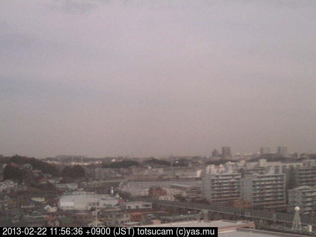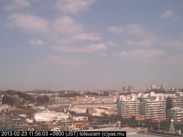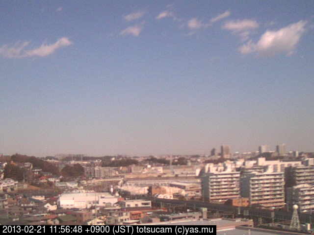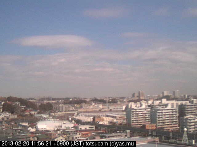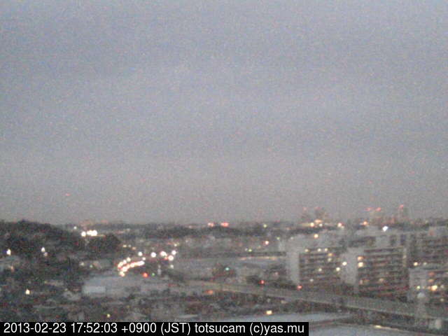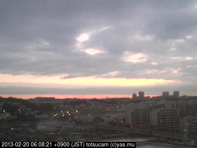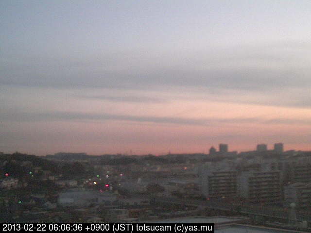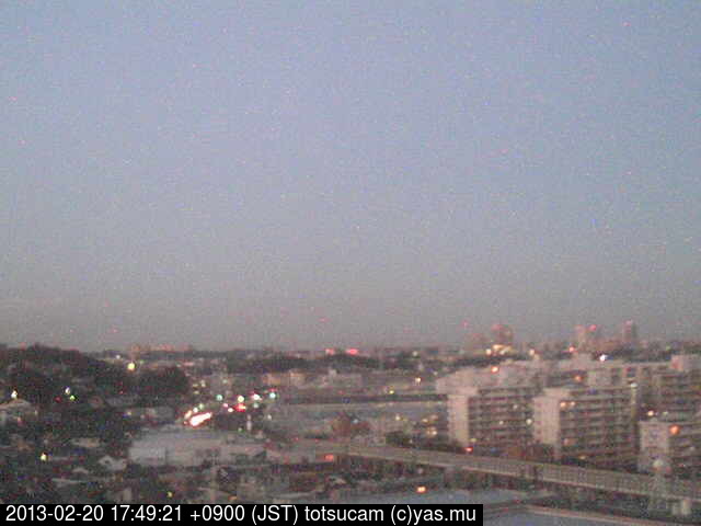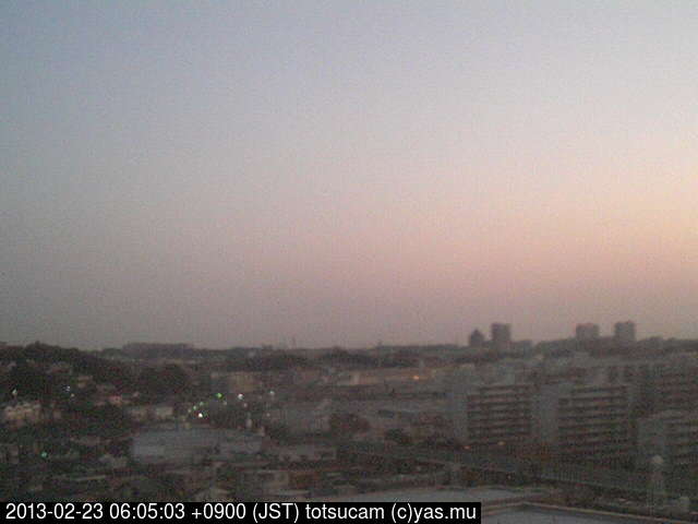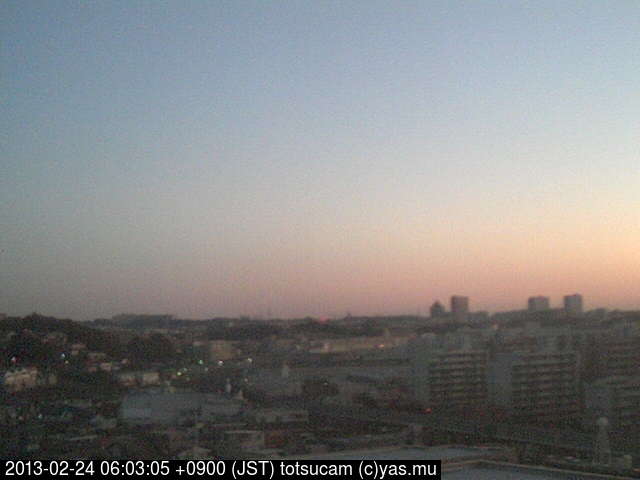 横浜市戸塚駅周辺から 東戸塚方面(北北東)を望む展望カメラの映像です。 左は現在の映像です。 下に並んでいるのは、 7日間に亘る日の出どき、昼間、夕暮れどきの写真(サムネイル)です。 それぞれ、日の出15分前、南中時、日没20分後の写真となっています。 各写真の下にはmpeg形式の動画へのリンクがあります。 それぞれ、日の出、南中、日没の前後1時間の画像です。 右欄にはその日24時間の動画へのリンクがあります。 この7日間以外は日付が一覧表示されています。 日付部分をクリックすると、 その日付から7日分が展開されて表示されます。