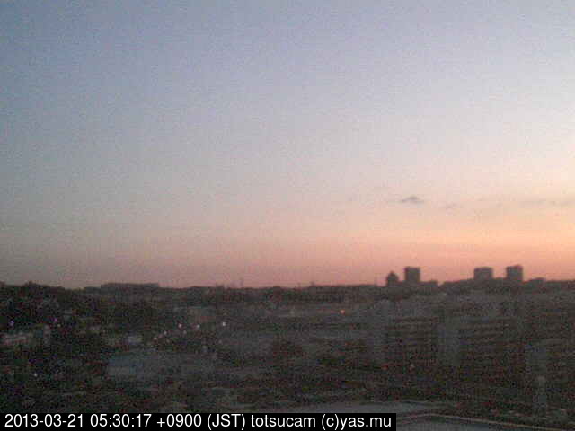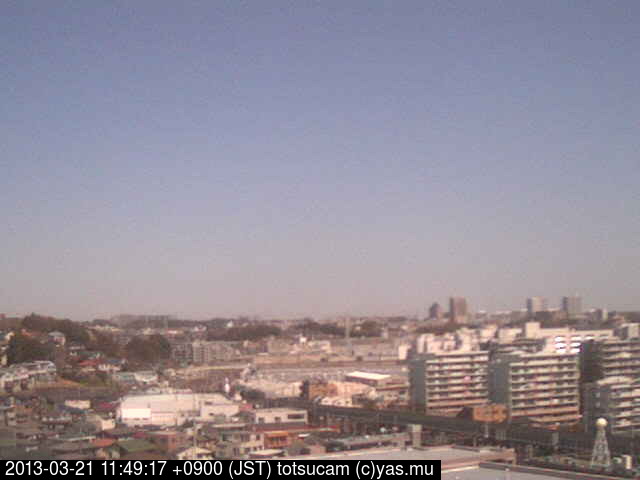 横浜市戸塚駅周辺から 東戸塚方面(北北東)を望む展望カメラの映像です。 左は現在の映像です。 下に並んでいるのは、 7日間に亘る日の出どき、昼間、夕暮れどきの写真(サムネイル)です。 それぞれ、日の出15分前、南中時、日没20分後の写真となっています。 各写真の下にはmpeg形式の動画へのリンクがあります。 それぞれ、日の出、南中、日没の前後1時間の画像です。 右欄にはその日24時間の動画へのリンクがあります。 この7日間以外は日付が一覧表示されています。 日付部分をクリックすると、 その日付から7日分が展開されて表示されます。