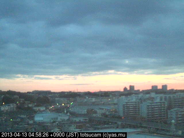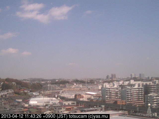 横浜市戸塚駅周辺から 東戸塚方面(北北東)を望む展望カメラの映像です。 左は現在の映像です。 下に並んでいるのは、 7日間に亘る日の出どき、昼間、夕暮れどきの写真(サムネイル)です。 それぞれ、日の出15分前、南中時、日没20分後の写真となっています。 各写真の下にはmpeg形式の動画へのリンクがあります。 それぞれ、日の出、南中、日没の前後1時間の画像です。 右欄にはその日24時間の動画へのリンクがあります。 この7日間以外は日付が一覧表示されています。 日付部分をクリックすると、 その日付から7日分が展開されて表示されます。