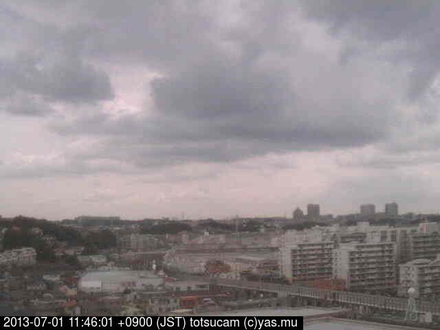 適度に曇った日の雲の動き (例: 2005-10-24) がとても楽しめます。 正面を横切っている高架は横須賀線下りです。 その下に横須賀線上り、東海道線、同貨物線が走っていますが、 高架に隠れていてよく見えません。 夜間は特に中央左寄りの車の動きがよく見えます。