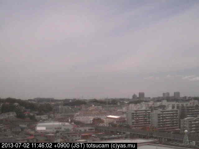 適度に曇った日の雲の動き (例: 2005-10-24) がとても楽しめます。 正面を横切っている高架は横須賀線下りです。 その下に横須賀線上り、東海道線、同貨物線が走っていますが、 高架に隠れていてよく見えません。 夜間は特に中央左寄りの車の動きがよく見えます。