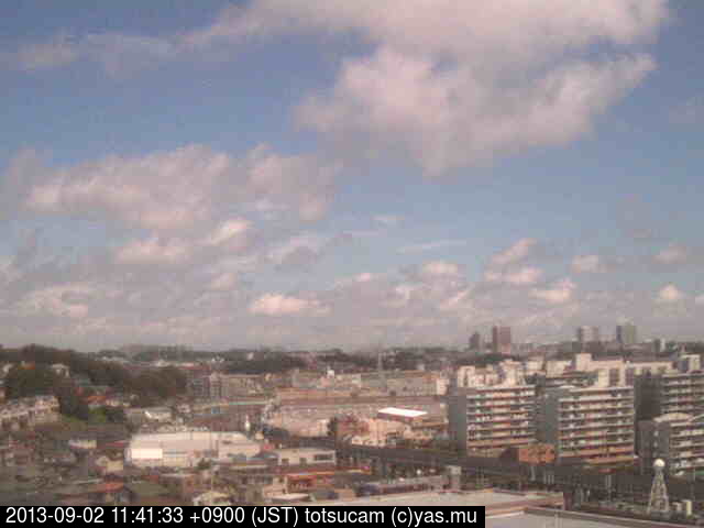 適度に曇った日の雲の動き (例: 2005-10-24) がとても楽しめます。 正面を横切っている高架は横須賀線下りです。 その下に横須賀線上り、東海道線、同貨物線が走っていますが、 高架に隠れていてよく見えません。 夜間は特に中央左寄りの車の動きがよく見えます。