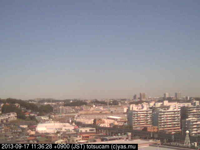 適度に曇った日の雲の動き (例: 2005-10-24) がとても楽しめます。 正面を横切っている高架は横須賀線下りです。 その下に横須賀線上り、東海道線、同貨物線が走っていますが、 高架に隠れていてよく見えません。 夜間は特に中央左寄りの車の動きがよく見えます。