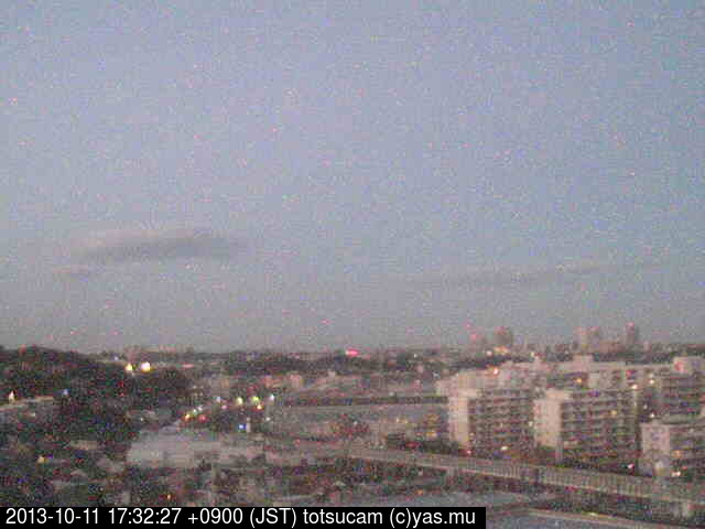 適度に曇った日の雲の動き (例: 2005-10-24) がとても楽しめます。 正面を横切っている高架は横須賀線下りです。 その下に横須賀線上り、東海道線、同貨物線が走っていますが、 高架に隠れていてよく見えません。 夜間は特に中央左寄りの車の動きがよく見えます。